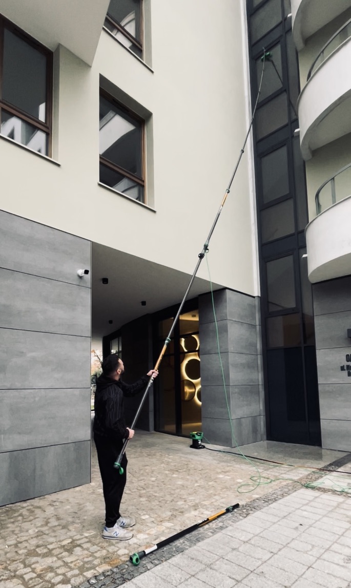 • W przypadku standardowych lub niższych budynków stosujemy klasyczną metodę mycia okien. Ta technika, wykorzystująca specjalistyczny sprzęt teleskopowy oraz wodę demineralizowaną, zapewnia nieskazitelny efekt bez smug i zacieków.